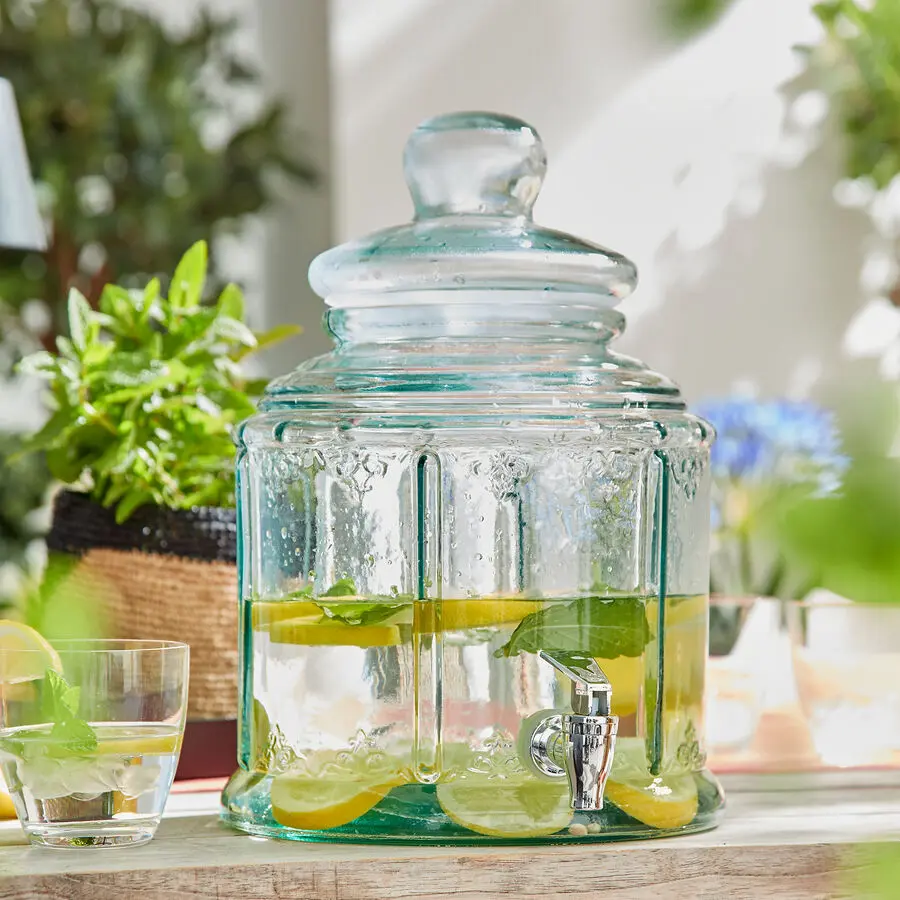 6,5 Liter fasst das nostalgisch verzierte, sechseckige Gefäß aus grün schimmerndem Glas.