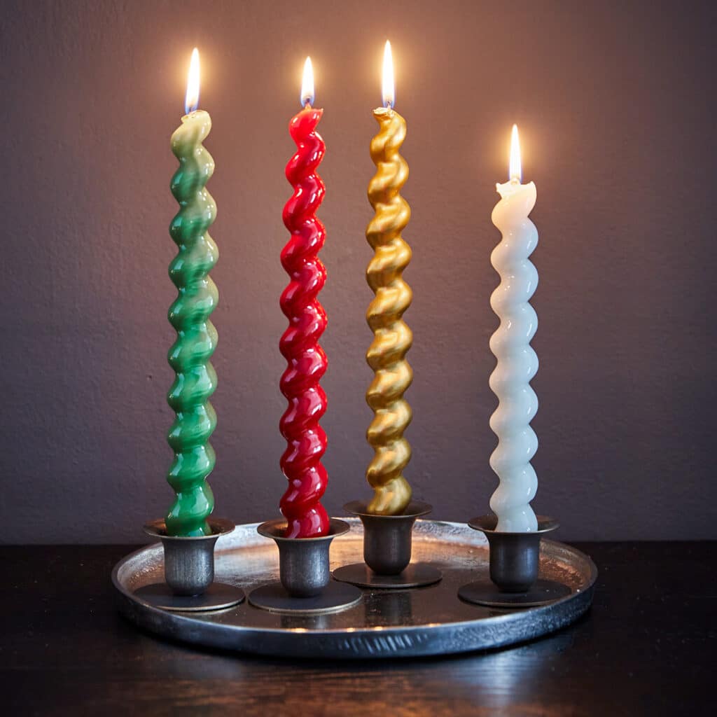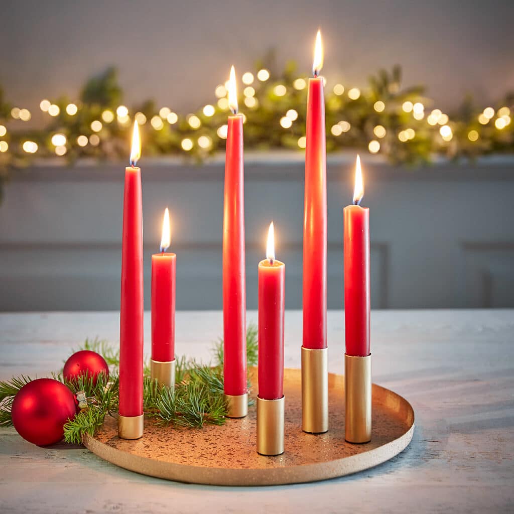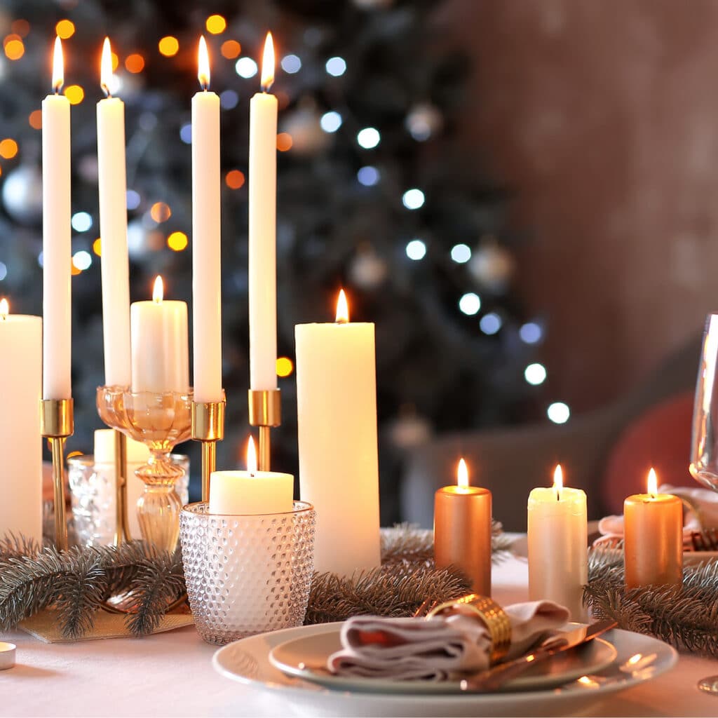 Trotz aller Innovationen bleiben echte Kerzen unverzichtbar. Stabkerzen verleihen der Tafel Höhe und Eleganz, während massive Stumpenkerzen für ruhige Beständigkeit sorgen. Ein traditioneller Adventskranz oder ein kunstvoller Kranzständer setzt zusätzliche Akzente und bringt den klassischen Weihnachtscharakter auf den Tisch. Wer verschiedene Kerzenarten kombiniert – etwa Stumpenkerzen auf dem Adventskranz, Stabkerzen in goldenen Kerzenständern und kleine Teelichter im Glas-Windlicht – schafft eine Weihnachtstischdeko, die lebendig, abwechslungsreich und zugleich harmonisch wirkt.