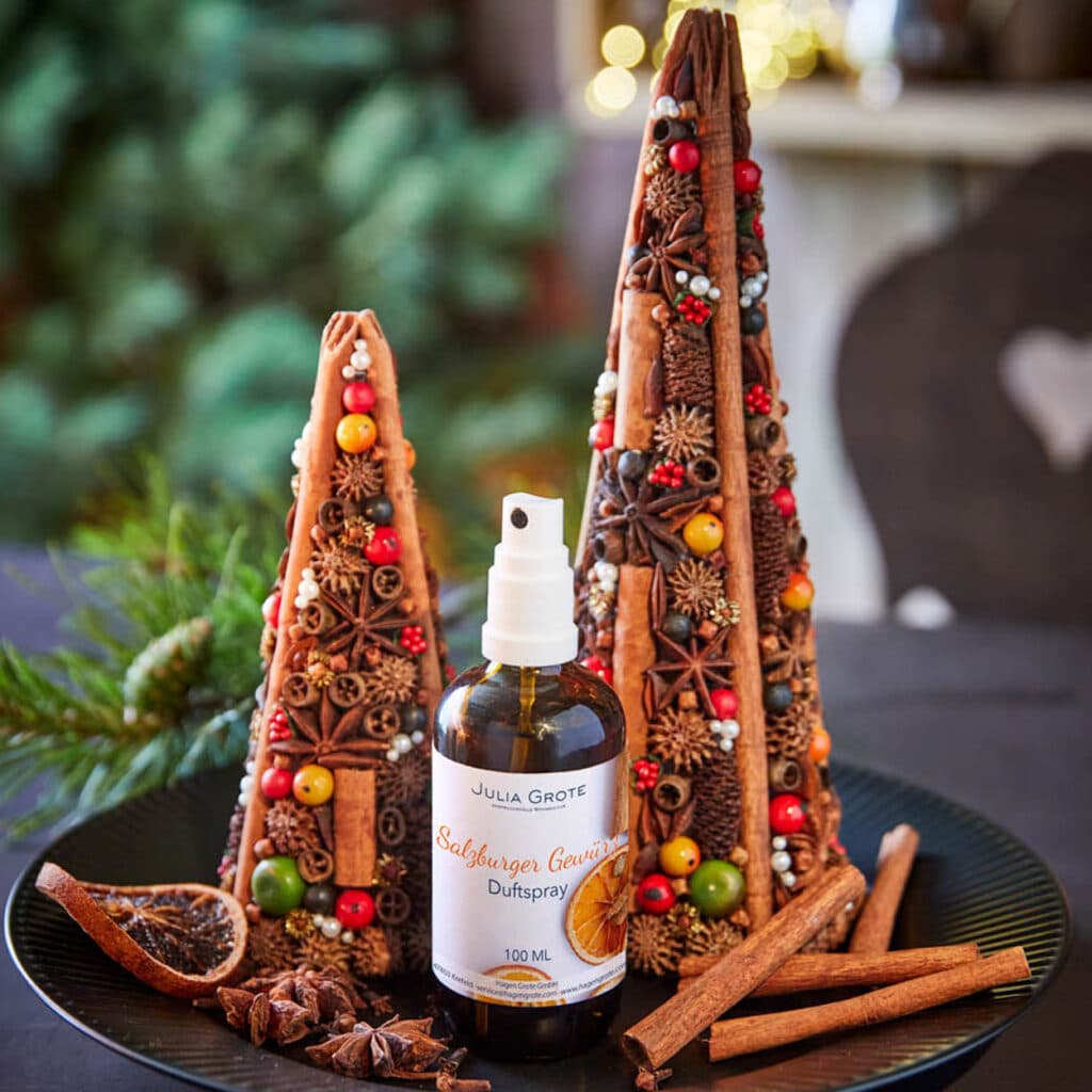 Der duftende Gewürzkranz aus Zimt, Piment, Nelkenpfeffer und Eukalyptus schafft festliche Atmosphäre auf Ihrem Weihnachtstisch. Handgefertigt mit Naturgewürzen und dekorativen Beeren – auch als Türkranz ein stilvoller Akzent.