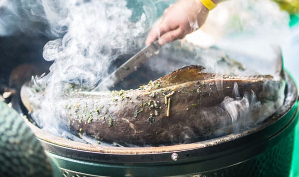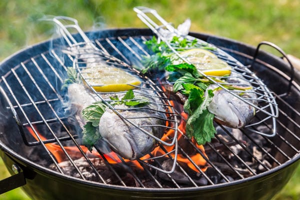 Zum Grillen auf dem Holzkohlegrill eignen sich festfleischige ganze Fische wie Dorade, Loup de Mer (Wolfsbarsch), Forelle und als Fischfilet Lachs. Ganze Fische werden gewürzt und mit Kräutern gefüllt. Alle 3 cm sollte beidseitig die Haut schräg eingeschnitten werden, damit sie nicht unkontrolliert aufplatzt. Mit Öl einpinseln und in Alufolie, mit der glänzenden Seite nach innen, einschlagen. Wenn man ein Schüsschen Weißwein in die Umhüllung gibt, bleibt der Fisch besonders saftig. Die Verwendung von Fisch Grillkörbchen sind beim Wenden und entnehmen des Fische eine schöne Erleichterung. Fisch Filets sollten in Alu Grillschalen zubereitet werden. Ganze Fische sind je nach Größe in etwa 10 bis 15 Minuten gar, für Fischfilets reichen 8 Minuten Garzeit. Bei ganzen Fischen, erkennt man dies daran, dass sich die Rückenflosse leicht herauslösen lässt.