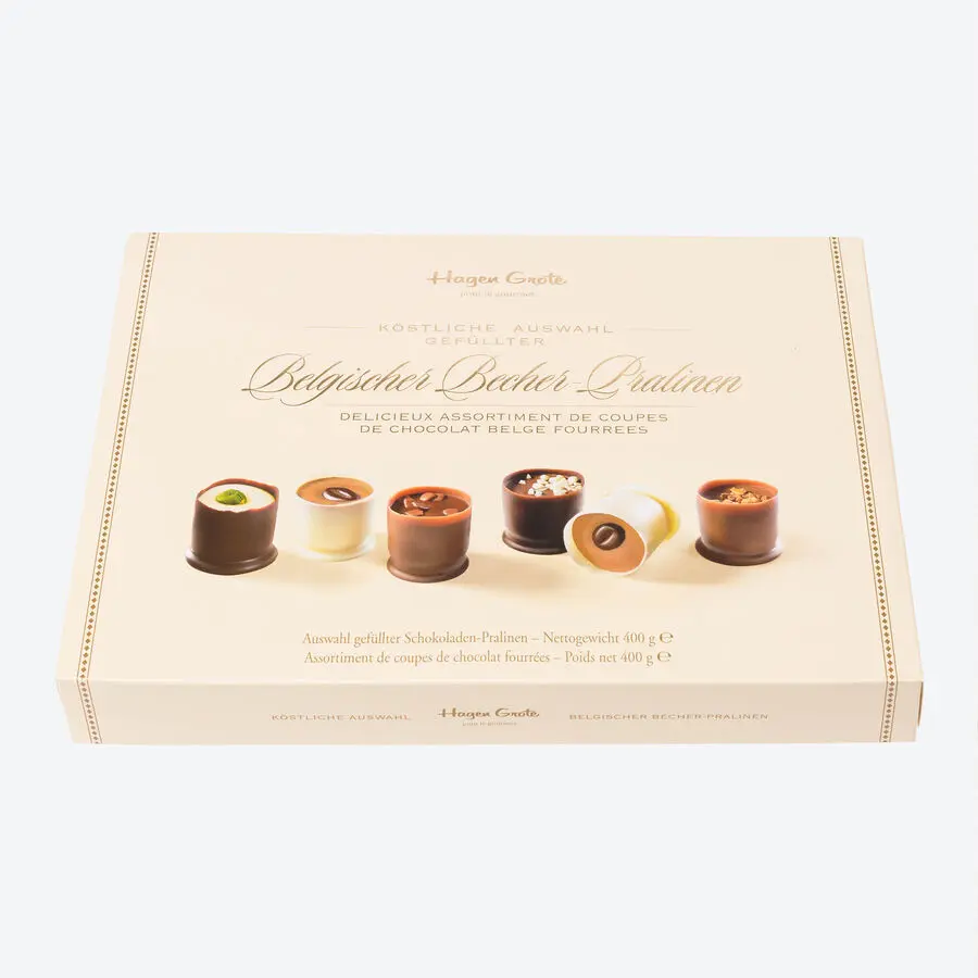 Seit 1912 ein Klassiker: hauchdünne Becher aus Vollmilch-, Zartbitter- und weißer Schokolade, gefüllt mit 5 erlesenen Kompositionen – Karamell, Kirsch, Marc de Champagne, Mokka und Praliné. Perfekt zum Kaffee oder als feine Dessertgarnitur.