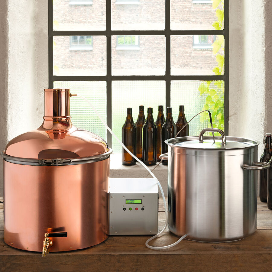 100 % lebensmittelgerecht, Würzepfanne Kupfer, Läutertopf gebürsteter Edelstahl, mit Sicherheitsdeckel ca. 60 x 60 x 60 cm hoch, wiegt ca. 28 kg, mit digitalem Bedienfeld, Außenkocher (Heizleistung 2 kW), Pumpe und Temperaturfühler.