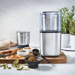 Zwei abnehmbare Mahlbehälter werden auf den leistungsstarken, leisen Motor im Edelstahlkorpus aufgesetzt und mit dem Impulsschalter durch leichten Druck betrieben. Mit dem 2-flügeligen Schlagmesser mahlen Sie in Sekunden alle harten Gewürze von grob bis fein, stellen eigene Gewürzmischungen her oder mahlen Kaffee. Im Edelstahlbehälter mit dem scharfen 4-flügeligen Messer lassen sich frische Kräuter perfekt zu köstlichen Pestos und Dips verarbeiten. Durch die transparente Abdeckung können Sie den Mahlvorgang permanent beobachten und die Zutaten anschließend direkt im Mahlbehälter aufbewahren.