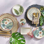 Das Design der edlen Geschirrserie ist inspiriert von der faszinierenden Pflanzen- und Blütenvielfalt der Karibikinsel Aruba. Warme, harmonische Farben und feiner Golddruck bringen einen Hauch Exotik auf den exklusiv gedeckten Tisch. Jedes Teil aus feinstem, hochwertigem Steingut in Creme ist mit einem detailreichen Dekor versehen und glasiert. Die eleganten, großen Essteller sind mit einem feinen Goldmuster und Goldrand gestaltet. Die unterschiedlichen Motive der Serie lassen sich wunderbar kombinieren und schmücken den sommerlichen Tisch, eine festliche Kaffeetafel oder elegante Gartenparty.