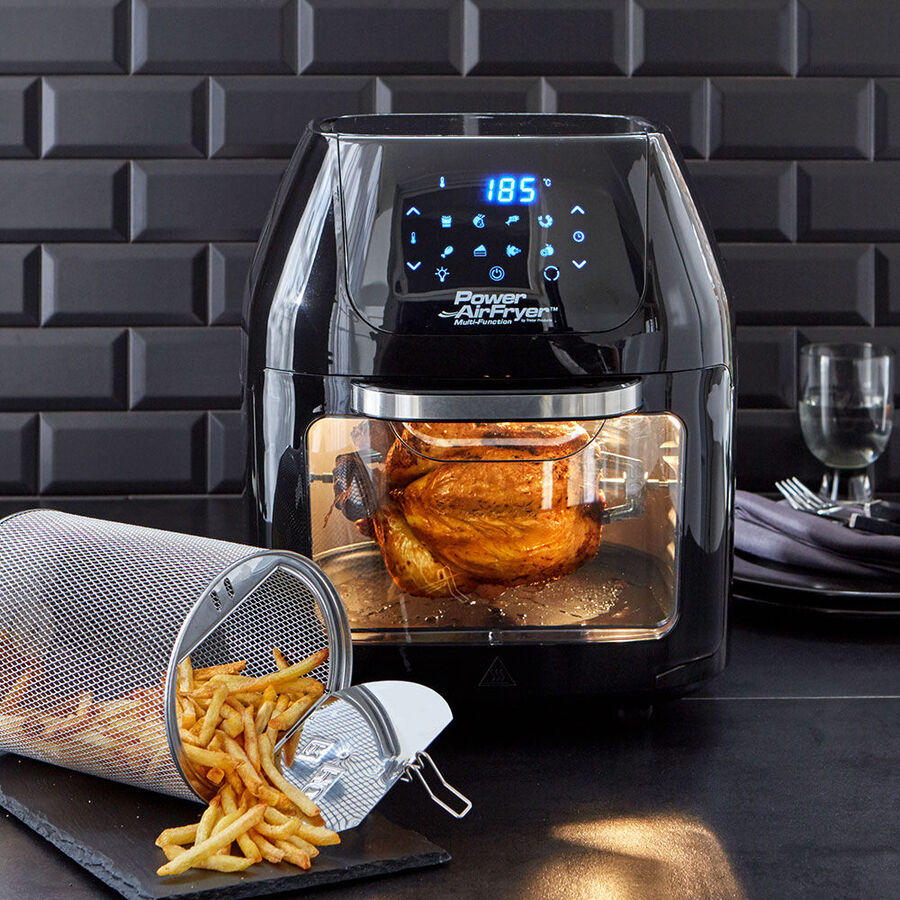 Dank modernster Heißluft-Technologie bereiten Sie knusprige Pommes frites, leckere Zwiebelringe oder saftige Chicken Wings nahezu fettfrei und ganz ohne Öl, Frittierfett oder Butterschmalz zu. Heißluftwirbel umgibt die Speisen konstant. Hähnchen werden außen schön knusprig und innen supersaftig - ganz ohne lästigen Frittiergeruch. Mit 8 voreingestellten Programmen lassen sich Speisen frittieren, dörren, braten, backen oder auch toasten. Praktisch: Dank großem Sichtfenster haben Sie Gemüse, Fleisch oder Fisch während des Garvorgangs stets im Blick. Gleichzeitiges Arbeiten auf 3 Ebenen.