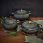 Seit 1925 fertigt Le Creuset in Frankreich hochwertigstes Kochgeschirr aus kratzfest emailliertem Gusseisen. Es nimmt Wärme schnell auf, speichert sie lange und gibt sie gleichmäßig weiter. Perfekt gelingt in diesen Töpfen das Anbraten bei hohen Temperaturen, das langsame, sanfte Schmoren oder auch Überbacken. Große Griffe und elegante, goldene Edelstahlknäufe ermöglichen sichere Handhabung auch mit Topfhandschuhen. Deckel-Stabilisatoren verhindern Klappern und Verrutschen. Mit dauerhaft glänzender Emaillierung ist es ideal als Serviergeschirr. 3,5 l Inhalt, 40 x 31 x 14 cm (B/T/H).