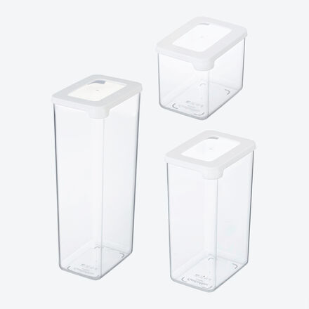 Dank dieser transparenten Behälter haben Sie jetzt alle Vorräte ständig im Blick. Lebensmittelgerechte Spezialdichtungen in den luft- und wasserdicht schließenden, ebenfalls transparenten Deckeln bewahren appetitliche Frische. Untereinander stapelbar, alle Maße auf handelsübliche Packungsgrößen sowie auf Küchenschrank-, Schubladen-, Kühlschrankmaße abgestimmt.